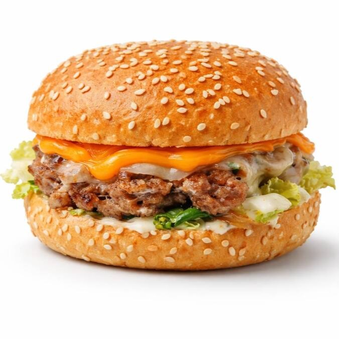 Pão com gergelim, molho cheddar, carne, acelga, cebola caramelizada ou crua, molho especial j.