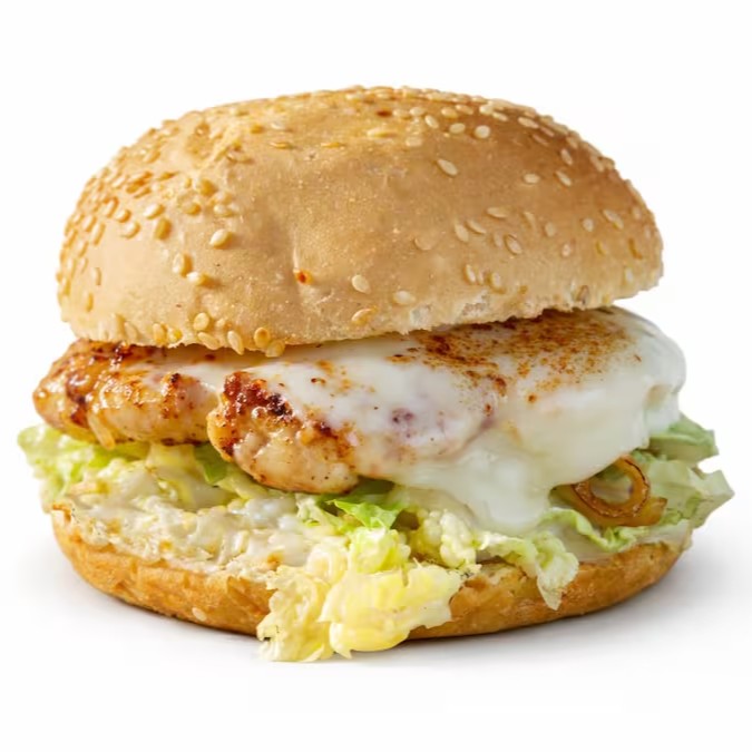 Pão com gergelim, frango em cubos, queijo, acelga, cebola caramelizada ou crua, , molho especial j.