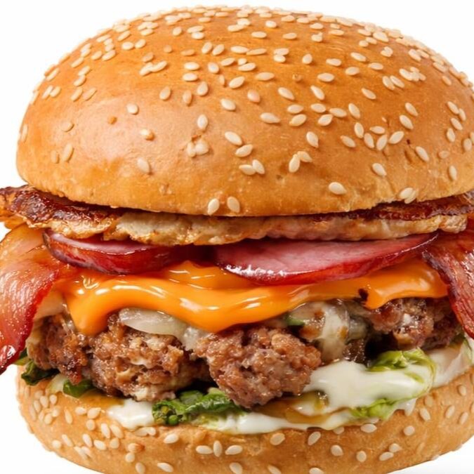 Pão com gergelim, 2 carnes, queijo, acelga, cebola caramelizada ou crua,, molho especial j.