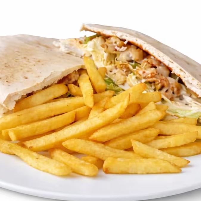 Pão Sírio, Frango, Queijo Mussarela, Tomate, Cebola Caramelizada, Acelga, Maionese Caseira, Molho Barbecue e Batata Frita
