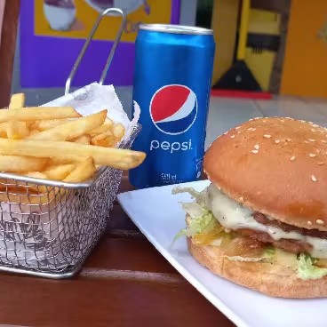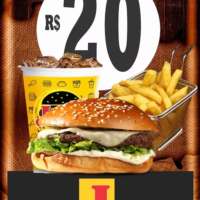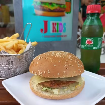 Pão, queijo cheddar, carne, acelga, cebola caramelizada ou crua, batata frita, refrigerante (copo 300ml), molho especial j.