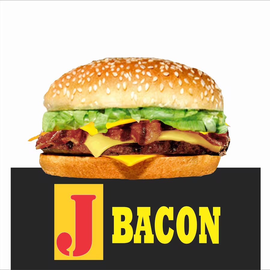 Pão, 100g bland de carne, queijo mussarela, bacon queijo cheddar, cebola caramelizada ou crua, acelga, tomate e molho especial j, molho barbecue.