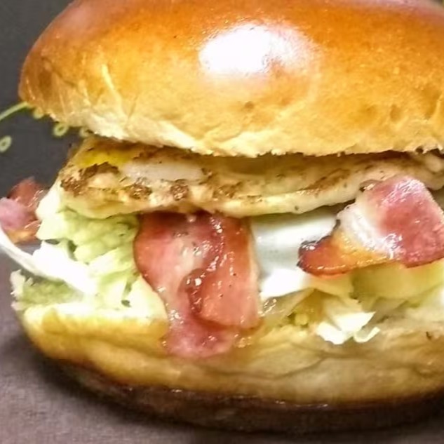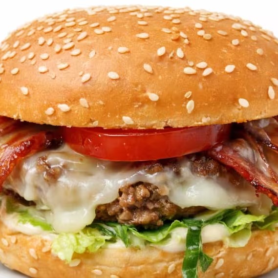 Pão com gergelim, bacon, carne, queijo, acelga, cebola caramelizada ou crua, molho especial j.