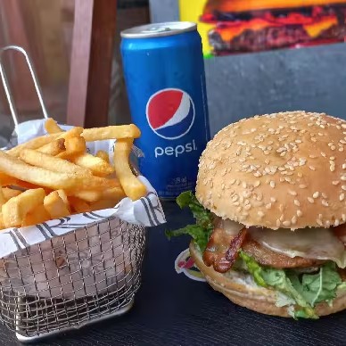 Pão australiano, bland de carne, bacon, queijo cheddar, cebola caramelizada ou crua, acelga, batata frita, refrigerante (copo 300ml), molho especial j.