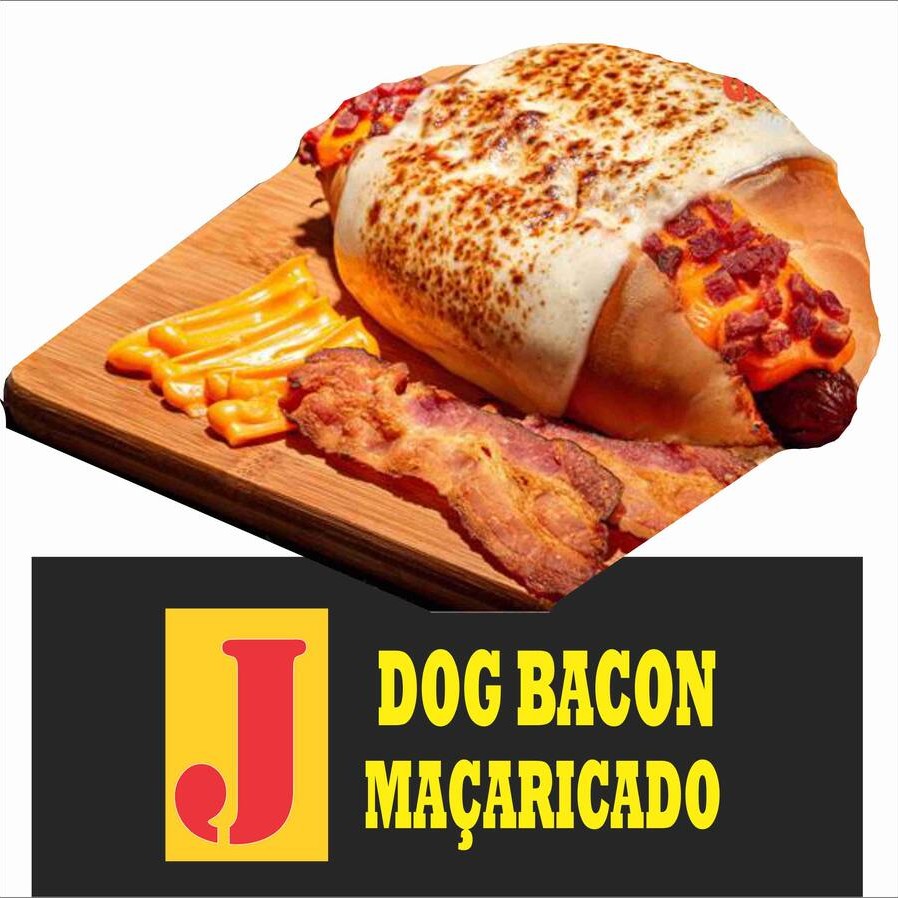 Pão com gergelim, carne, bacon, ovo, queijo, salsicha, queijo cheddar, cebola caramelizada ou crua, acelga, molho especial j.