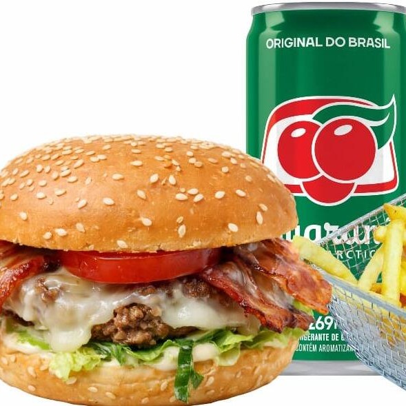 Pão, bacon, carne, queijo, acelga, cebola caramelizada ou crua, batata frita e refrigerante (lata 269ml), molho especial j.