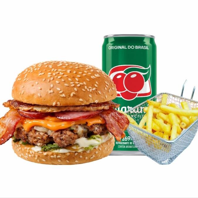 Pão, 2 carnes, queijo, acelga, cebola caramelizada ou crua, batata frita, Guaraná antártica 269ml molho especial j.