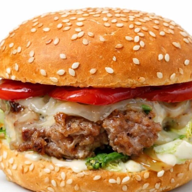 Pão com gergelim, carne, queijo, acelga, cebola caramelizada, molho especial j.