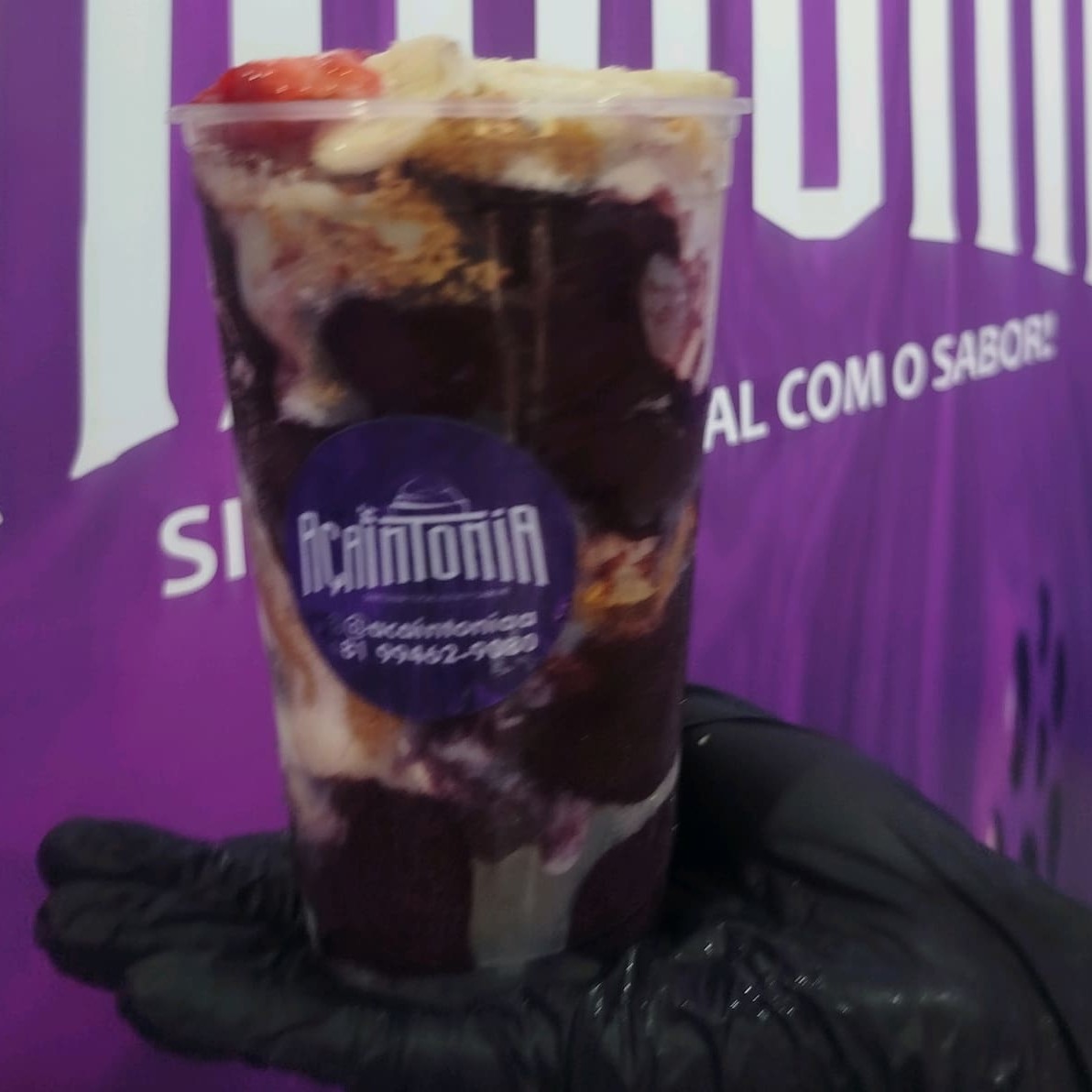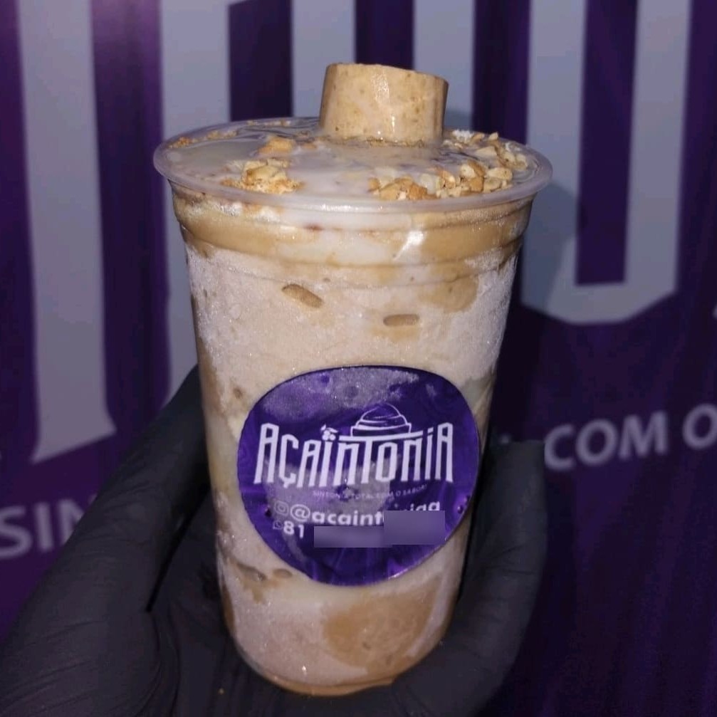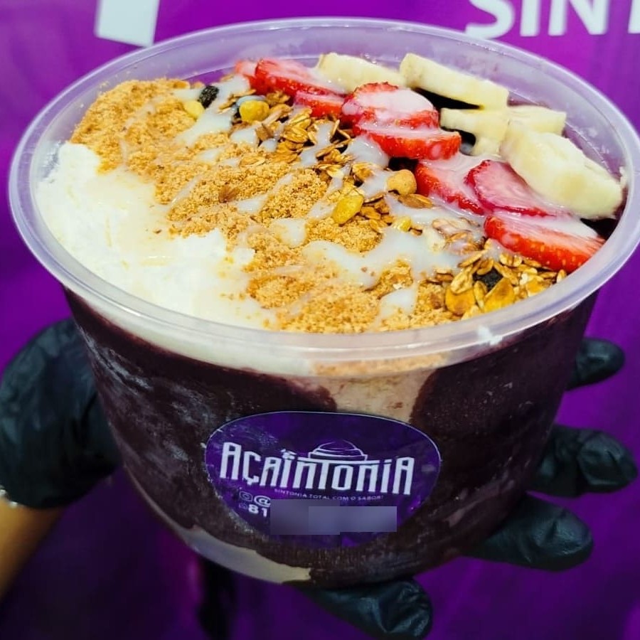 Açaí acompanhado de leite condensado, granola, banana, farinha de amendoim, leite em pó.
