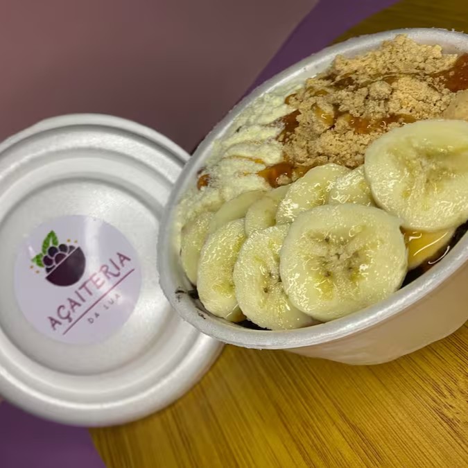 Desfrute do nosso cremoso Açaí , perfeitamente equilibrado com 60g dos seus complementos, caldas e frutas preferidos, criando uma camada irresistível no topo para uma experiência de sabor intensa e visualmente atraente.