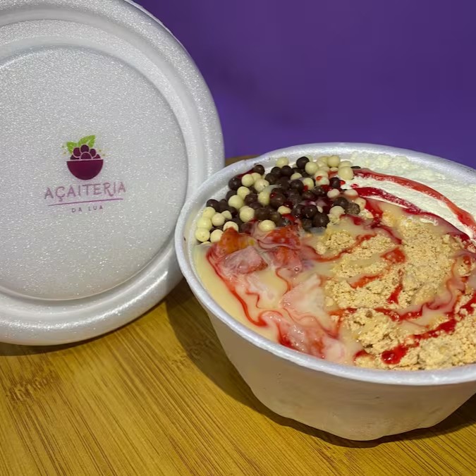 Tudo vem bem caprichado e organizado: o açaí por baixo, roxinho e consistente, e ao lado todos os complementos separados para você montar do seu jeitinho. Granola crocante, leite condensado, paçoca esfarelada, leite em pó e frutas fresquinhas (como banana e morango) — cada sabor no seu potinho individual, preservando o frescor e a textura.