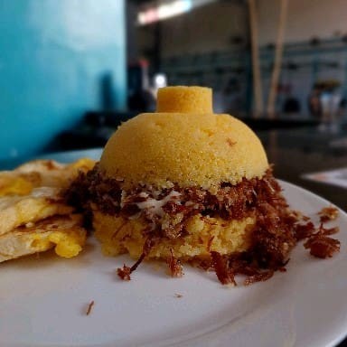 Cuscuz fofinho recheado com carne desfiada e requeijão profissional, carne de sol assada na manteiga com cebola, fatia de queijo coalho e vinagrete