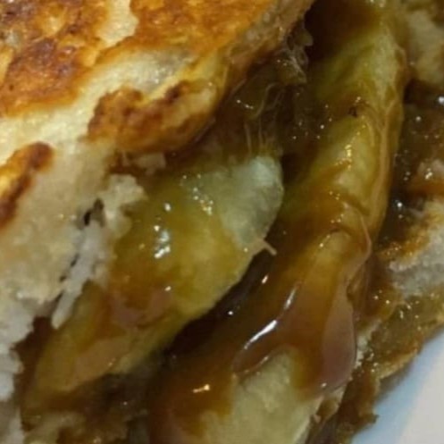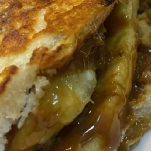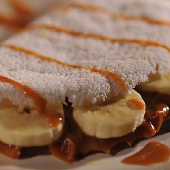Camada de queijo coalho assado por fora. Recheado com banana assada e doce de leite.