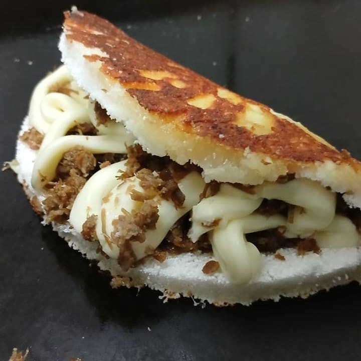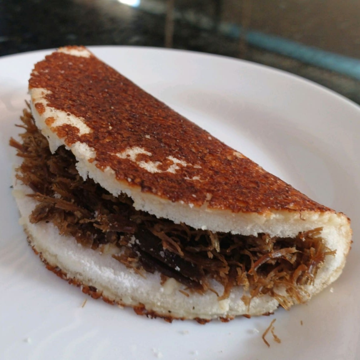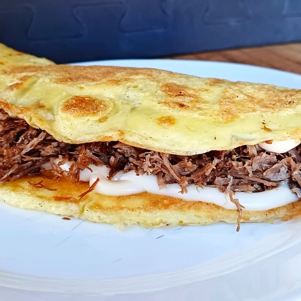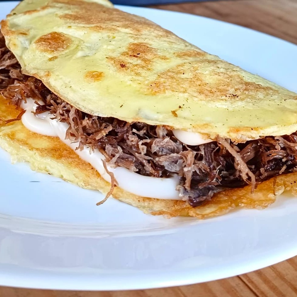 A massa leva dois ovos, 35g de goma de tapioca. Recheado com 80g de carne de sol desfiada e pré-assada na manteiga + requeijão