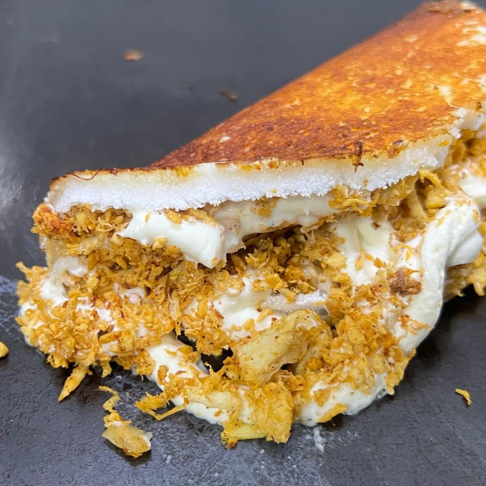 Preparado com uma camada generosa e derretida de queijo coalho, tornando a massa crocante e saborosa. Recheado com frango e queijo.