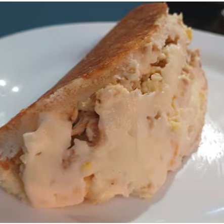 Dois ovos e goma na base, recheado com Frango desfiado, bem temperado, e Queijo coalho derretido.