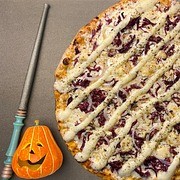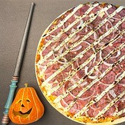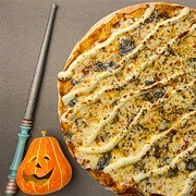 Poção mágica de tomate, cobertura mágica de queijo mussarela, parmesão delicadamente salpicado, gorgonzola, que traz uma nota misteriosa e intrigante à experiência e, para completar, uma poção especial de requeijão.
