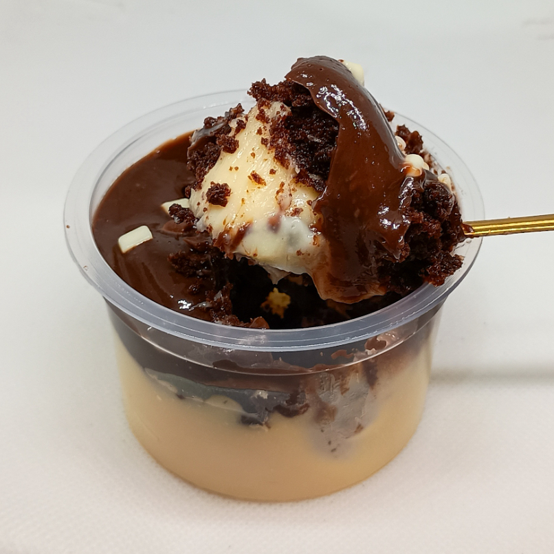 Camadas de creme leitinho e creme de chocolate intercaladas com Brownie chocolatudo! Tamanho p, 1 litro. Serve Aprox 4 pessoas .