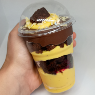 Camadas de : Creme de maracujá, pedaços de brownie ,brigadeiro cremoso de chocolate 50% cacau e mais brownie para decorar!! Serve de 3 a 5 pessoas.