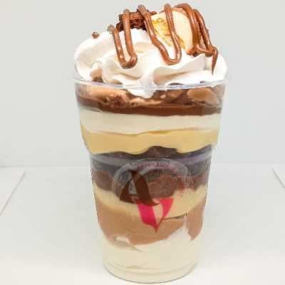 Camadas de creme leitinho e creme de chocolate intercaladas com Brownie chocolatudo! Tamanho p, 1 litro. Serve Aprox 4 pessoas .