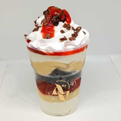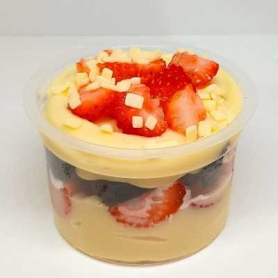Camadas de biscoito maisena , creme mousse leitinho, brigadeiro cremoso de leite em pó e morangos frescos em pedaços. 190g
