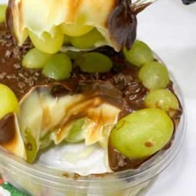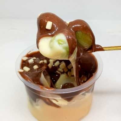 Creme branco, uvas sem semente e creme de chocolate. Serve 4 pessoas