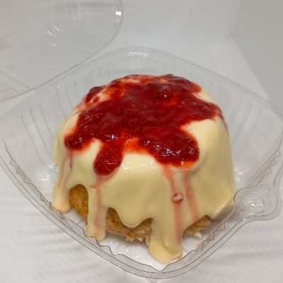 Massa de baunilha, cobertura cremosa de leite em pó e geleia caseira de morango. 12cm de diâmetro. Aprox. 300g.