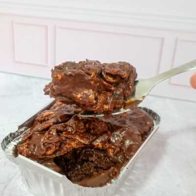 Pedaços de brownie afogados no recheio cremoso de leite em pó, pedaços de bombom ouro branco e creme de avelã. Peso final Aprox. 200g.