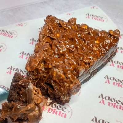 Maravilhosa torta crocante de brownie com brigadeiro, camada de brownie, brigadeiro cremoso de chocolate 50% cacau e cobertura crocante sabor creme de avelã.
