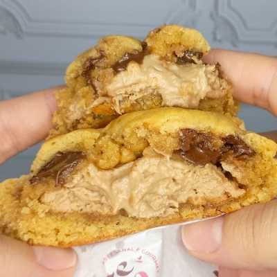 Deliciosa massa de cookie tradicional,macia por dentro com recheio de brigadeiro branco leitinho.