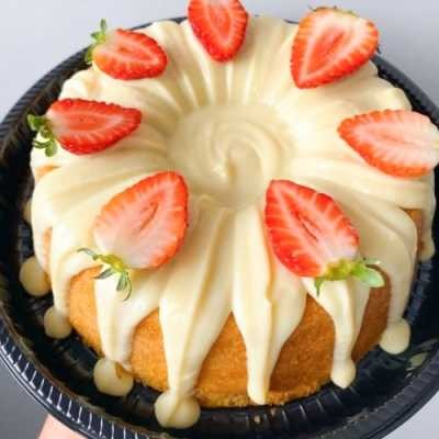 Massa de baunilha fofinha e úmida, cobertura cremosa de brigadeiro branco e morangos frescos para finalizar. 800g Aprox. , 16cm de diâmetro.
