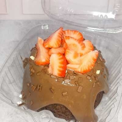 Massa fofinha e úmida de chocolate 50% cacau, cobertura cremosa de brigadeiro, morango fresco picado e granulé de chocolate nobre.