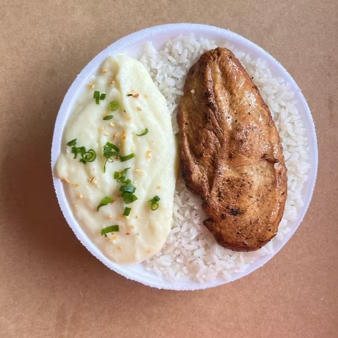 arroz, pure, feijão preto, e frango grelhado