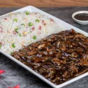 Uma Deliciosa combinação de Carne em tiras, cebola e molho especial, acompanhado de arroz chop suey.