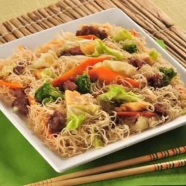 Um Delicioso Bifum, com carne em tiras, frango em cubos e legumes.