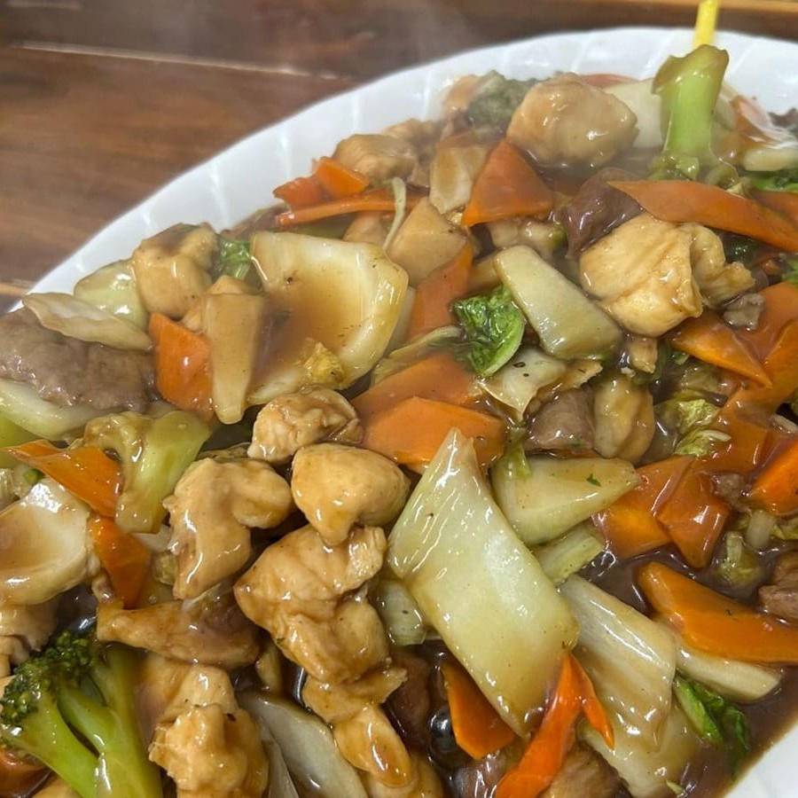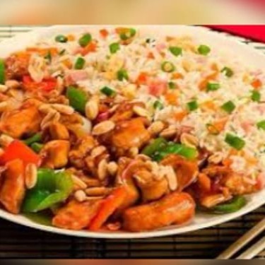 Uma deliciosa combinação de File de peito de frango em cubos com legumes e com nosso molho especial da casa, amendoim e arroz chop suey.