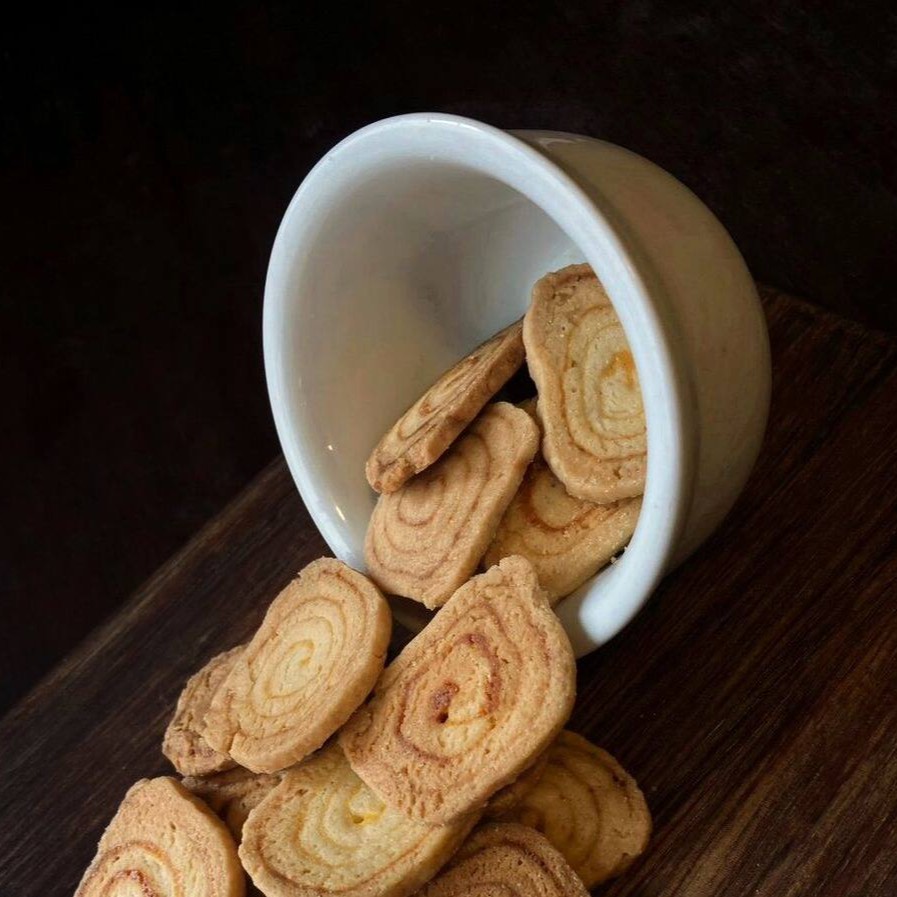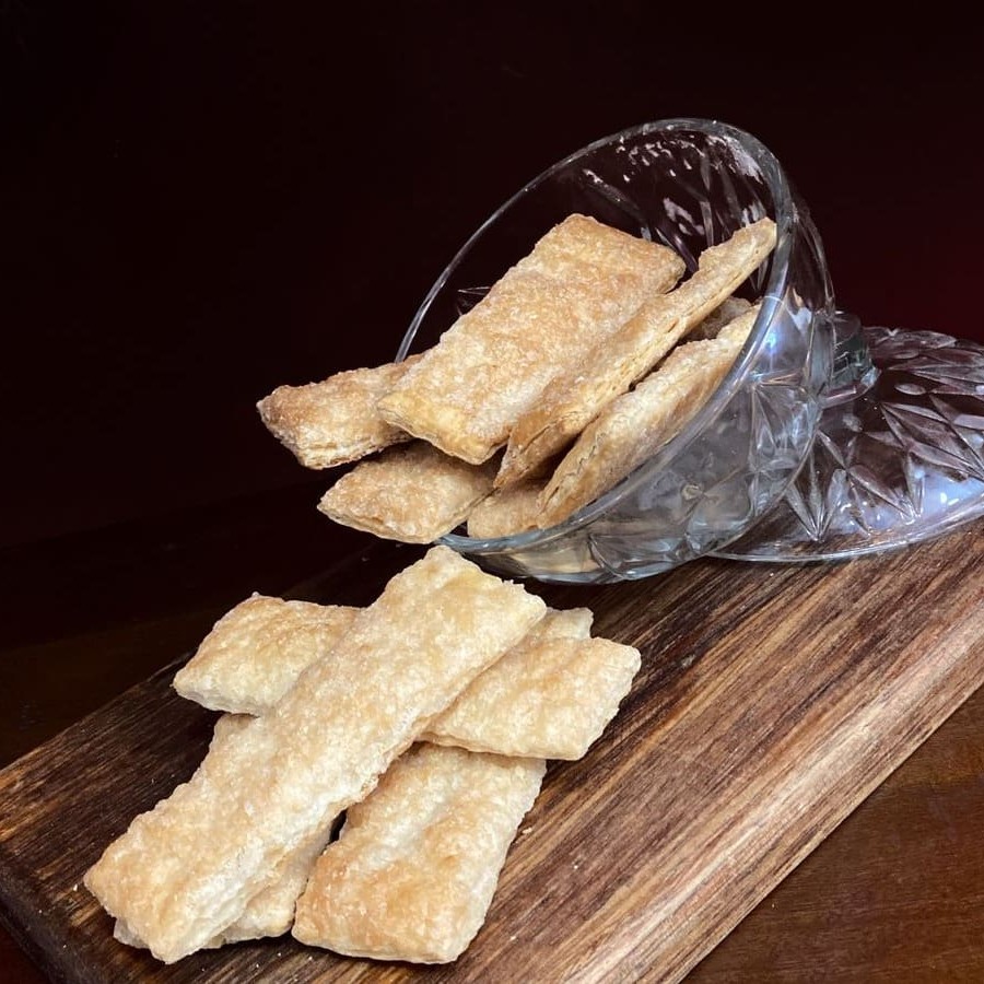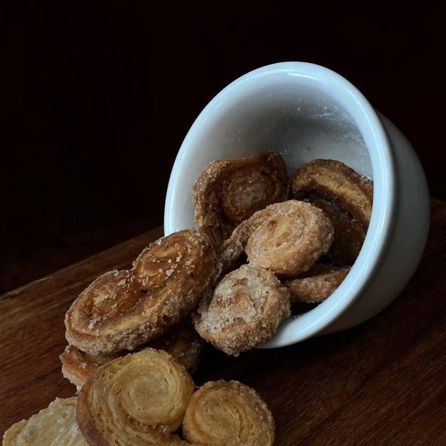 Delicadamente folheado e envolto em açúcar que se transforma em caramelo dourado ao forno, o palmier encanta pela crocância leve que se desfaz suavemente na boca. O equilíbrio entre a sutileza da massa e a doçura delicada faz dele um clássico da confeitaria, simples e ao mesmo tempo sofisticado. Um doce versátil que combina tanto com um café forte quanto com um chá suave, trazendo elegância e aconchego em forma de biscoito. Contém glúten.