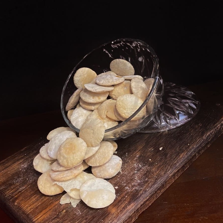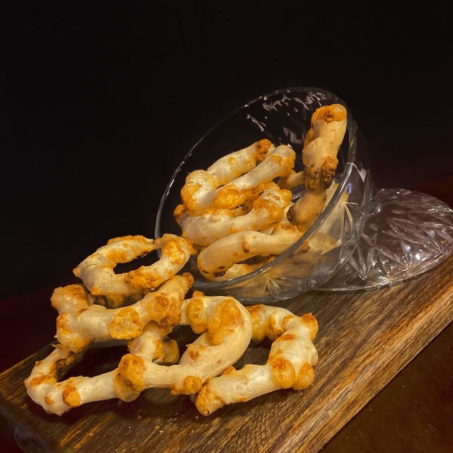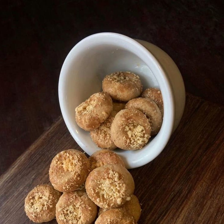 Feita com a suavidade da farinha de trigo e adoçada na medida certa com açúcar, essa rosquinha ganha leveza graças à gordura vegetal e ao fermento de batata, que juntos proporcionam uma textura delicada e macia. O sal realça o sabor e o provolone entra como o grande protagonista, trazendo um toque levemente salgado e aromático que contrasta com a doçura sutil da massa. Cada mordida revela um equilíbrio perfeito entre tradição e criatividade, resultando em um biscoito que derrete na boca e desperta memórias afetivas. Contém glúten.