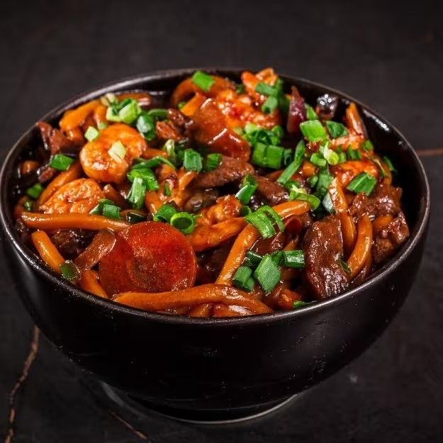Preparado com camarões, macarrão especial, vegetais salteados, frango em cubos e carne em tiras puxados no gergelim torrado com nosso molho yakisoba especialmente preparado.