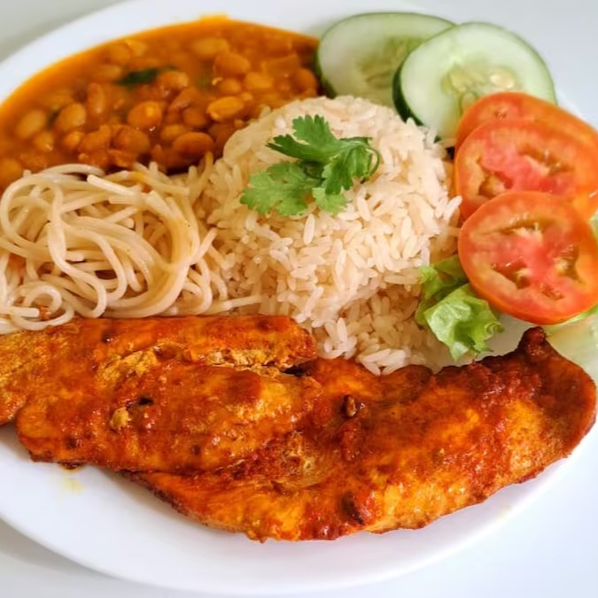 Delicioso file de frango, com feijão mulato , temperado com tempero caseiro, arroz e macarrão fresquinho no alho. Marmita de 750ml.