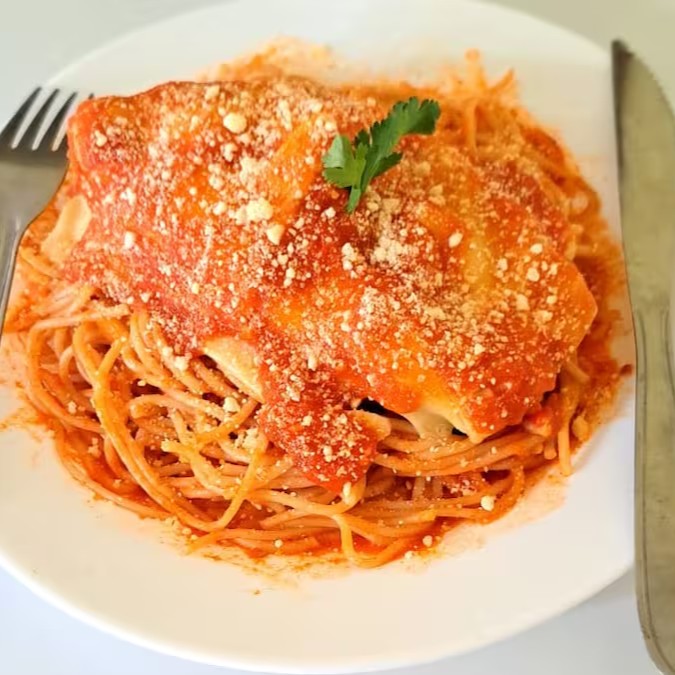 Com molho caseiro, filé de frango empanado, coberto com queijo mussarela derretido, queijo ralado e um macarrão espaguete com nosso molho especial caseiro. Uma verdadeira delícia.
