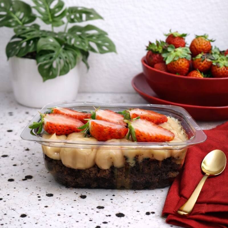 Delicioso Escondidinho de Brownie Sabor Bem Ninho, Feito com Deliciosos Pedaços de Brownie Premium, acompanhado do nosso delicioso Recheio de Leite ninho, finalizados Com Morangos