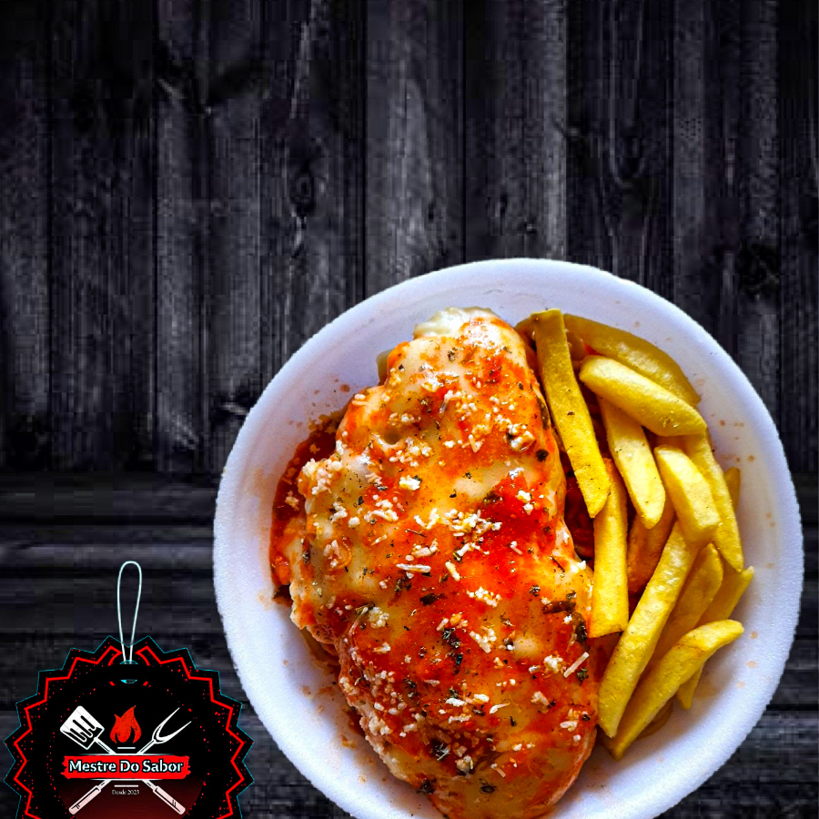 Parmegiana, acompanhado por macarrão batata frita e purê