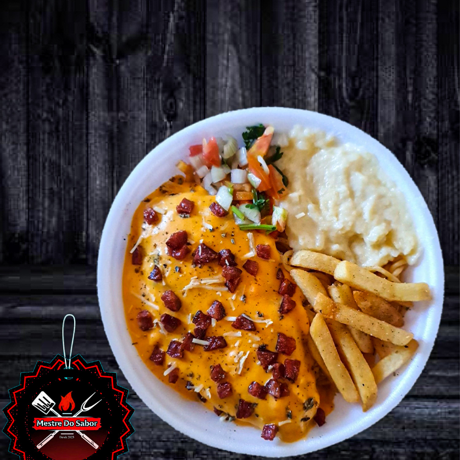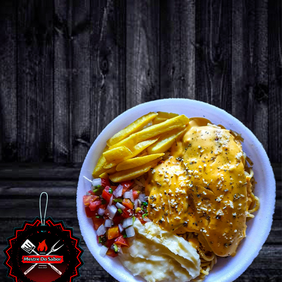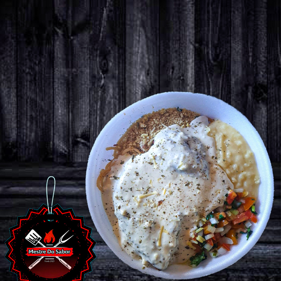 Delicioso frango a milanesa ao molho cheddar, com pedaços de Calabresa