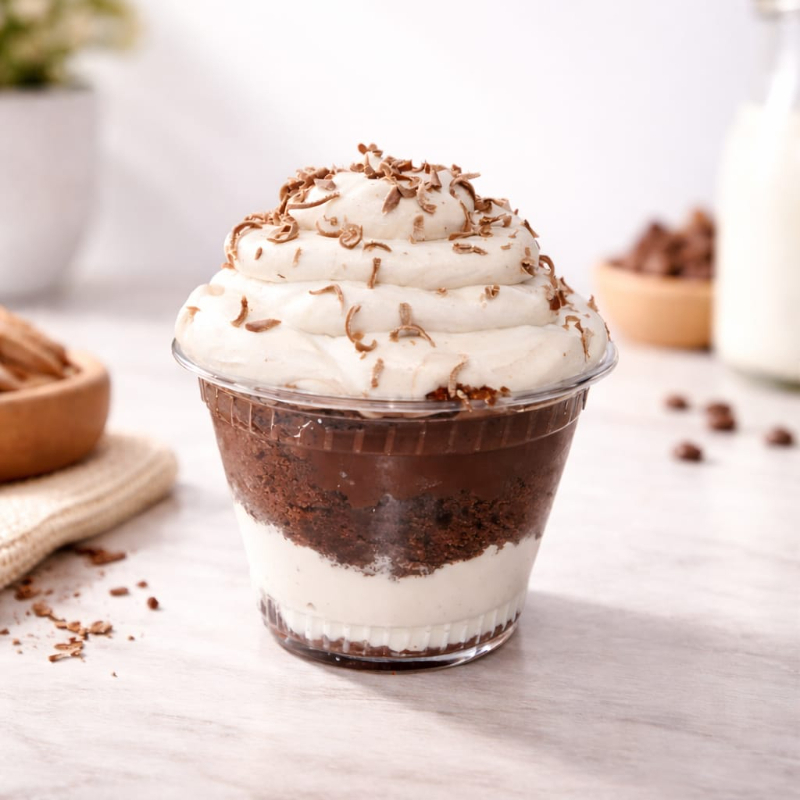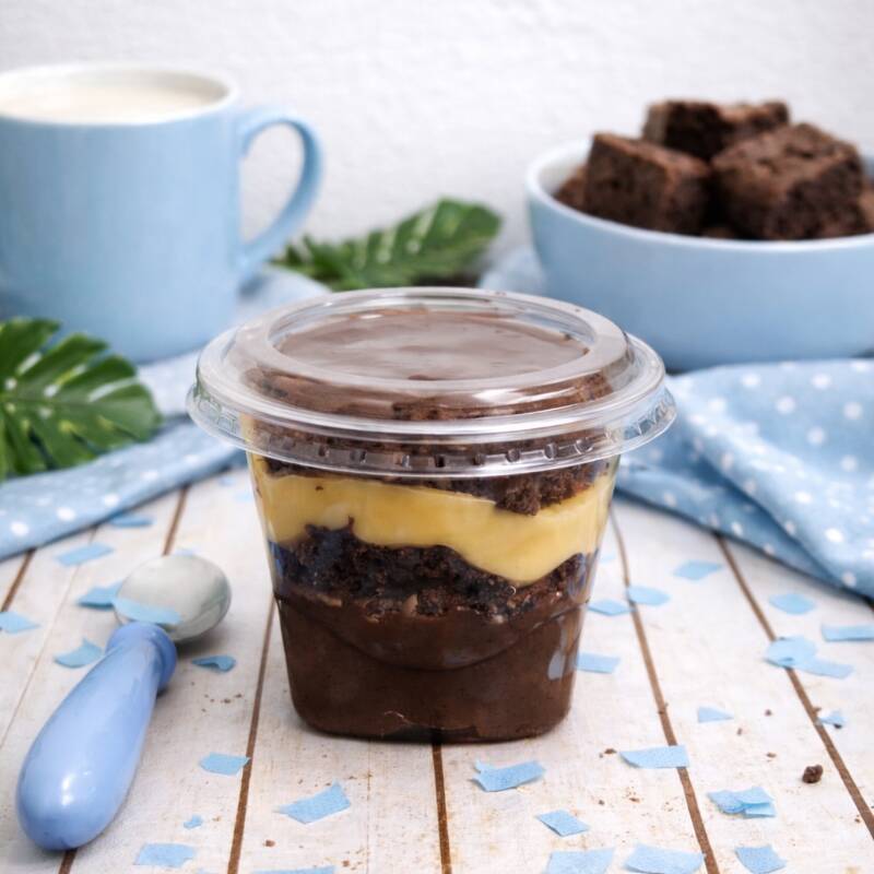 Delicioso copo brownie, composto por nosso recheio de chocolate com 50% cacau, pedaços de Brownie, finalizado com um delicioso Recheio de Leite Ninho.
