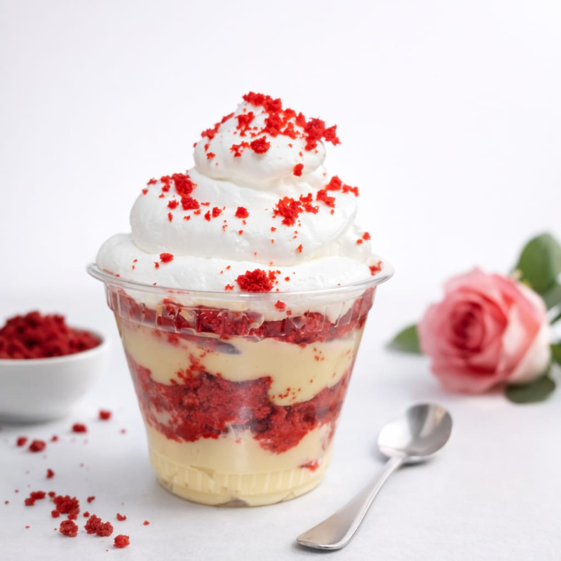 Copo Red Velvet, Feito com Recheio de ninho, deliciosos pedaços de Brownie Red Velvet, finalizado Com Chantininho e raspas de brownie