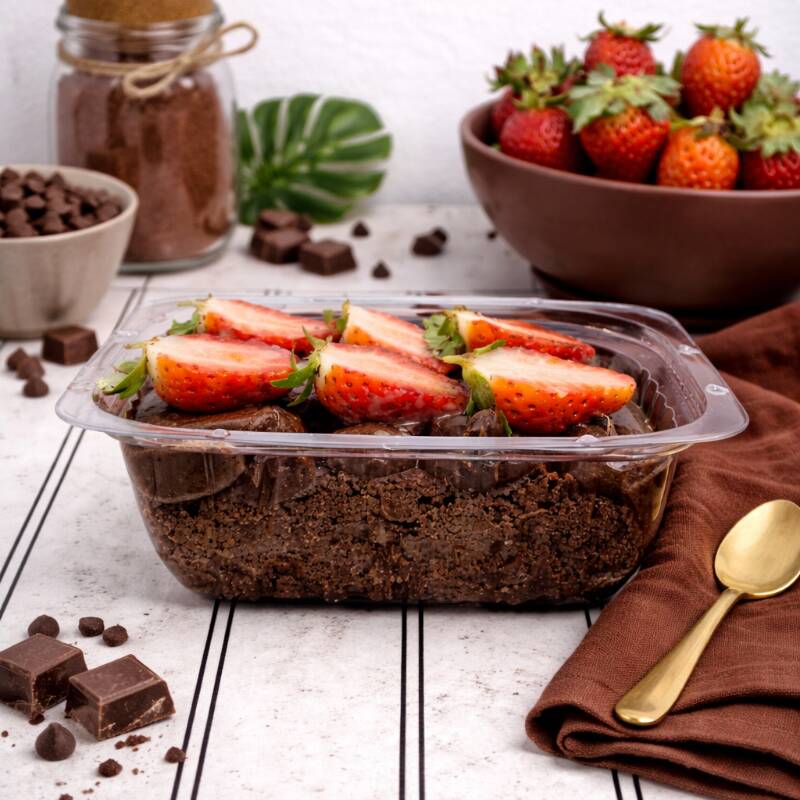 Escondidinho De Brownie Sabor Chocolate. Acompanhado por deliciosos pedaços de brownie premium, composto por Recheio de chocolate ao leite, finalizado com morangos