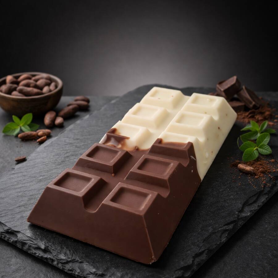 Deliciosa Barra De Chocolate Sabor Bem Casado, feita com chocolate branco e chocolate ao leite, acompanhada do nosso de delicioso recheio de Ninho e nosso recheio de chocolate