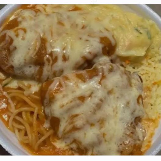 Deliciosa Parmegiana Completa, acompanhada de Arroz Branco ou carioca, Macarrão ao molho, Purê de batata, Queijo.
