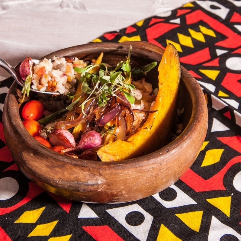 Feijão verde, amedoim, arroz, cebolas caramelizadas, jardineira de legumes, abóbora e tomates assados